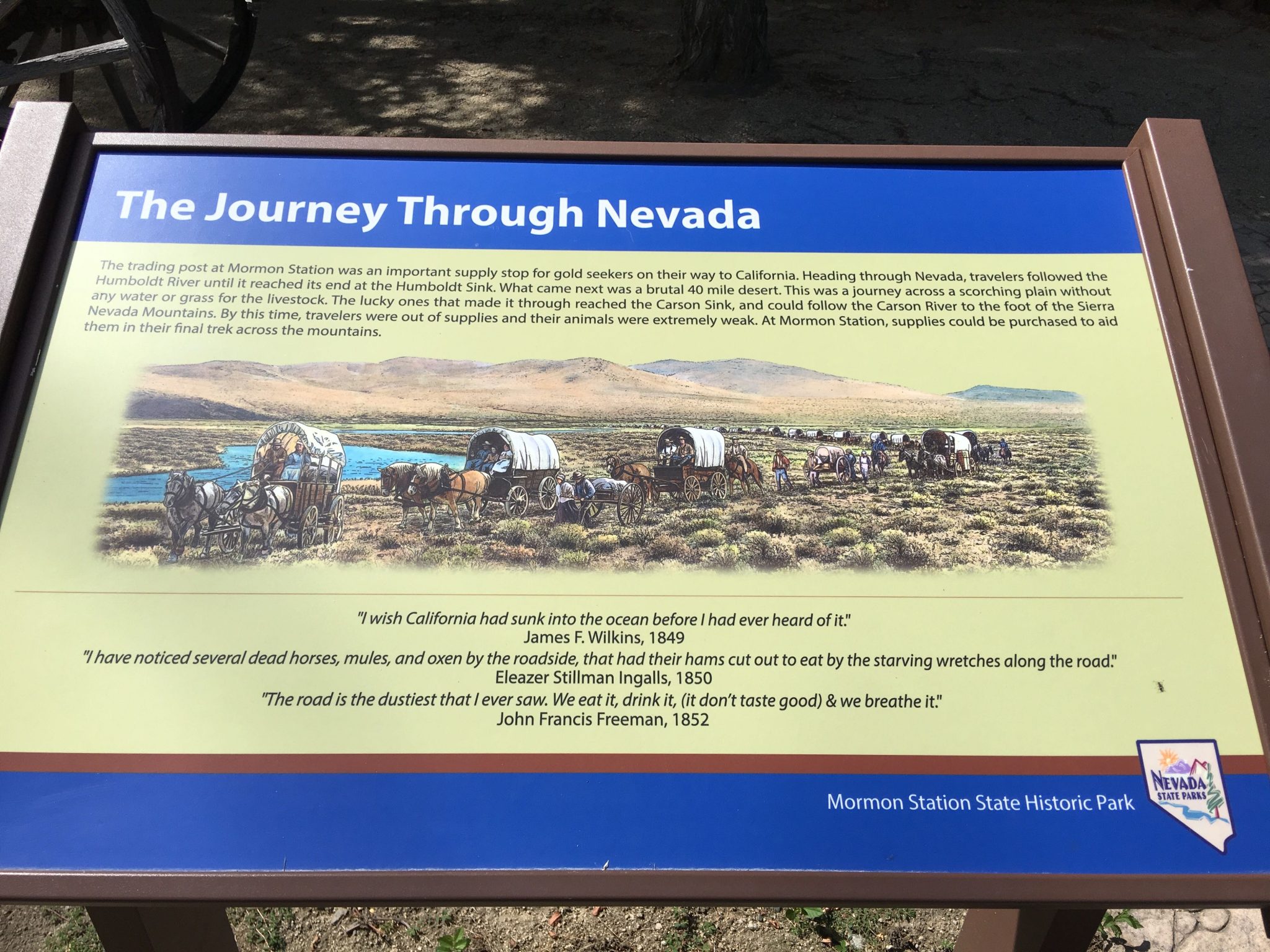 Genoa Country Innの真ん前にある緑豊かな州立史跡公園。ネバダ州とカリフォルニア州をつなぐ街道に金鉱等の交易所として1851年に建てられたのがモルモン・ステーション。園内は緑豊かで木陰のある散歩道があり、当時使われた馬車や農耕具などが展示されているスポットもあります。銅像は ジュノアの英雄、ジョン・”スノーシュー”・トンプソン。1856年~1876年の20年間、カリフォルニア州のプレイサーヴィルとジュノア間の郵便配達を無償で行い、冬の豪雪期間もスキー(あだ名はスノーシューだが、実際にはスキーを使用)を履いて配達をこなした凄い人です。