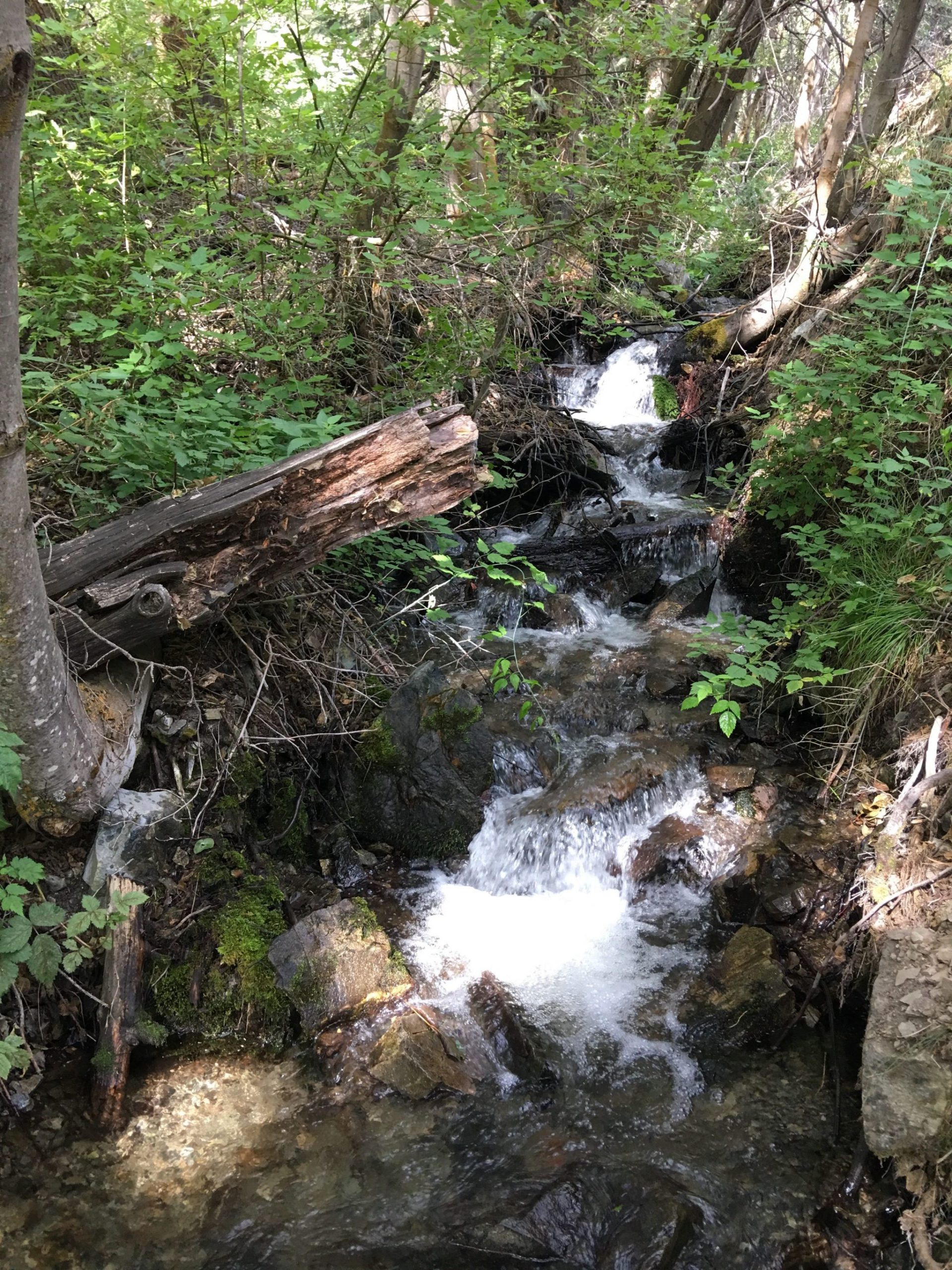 村はほぼ見終わったので、Genoa Bar and Saloonから南へすぐのCarson Streetを山側へ行くと道の終わりにGenoa Canyon Trailheadがあり、ここから里山ハイキングへ。村の北端へつながるGenoa Loop Trailは全長約8.2マイル(約13km) もあるので、行けるとこまで行って、出来れば1時間半くらいで見られる滝を見てから引き返そうというプランで歩き始めました。10分程で小さな滝というか渓流を見て涼んだ後、さらに山道をすすんでいくほどにスイッチバック度が増し、そして道幅が狭い上に片側切り落としで心臓バクバク。軽い気持ちの里山散歩には向かなかったなーと30分でUターンしました。ジュノアとカーソンバレーが見渡せるくらいには登ったのでとりあえずよし!としました。次回は装備と気持ちを万端にして先にある本命滝を拝みに行きたいものです。尚、Trailheadには4~5台のスペースの駐車場(無料)がありました。