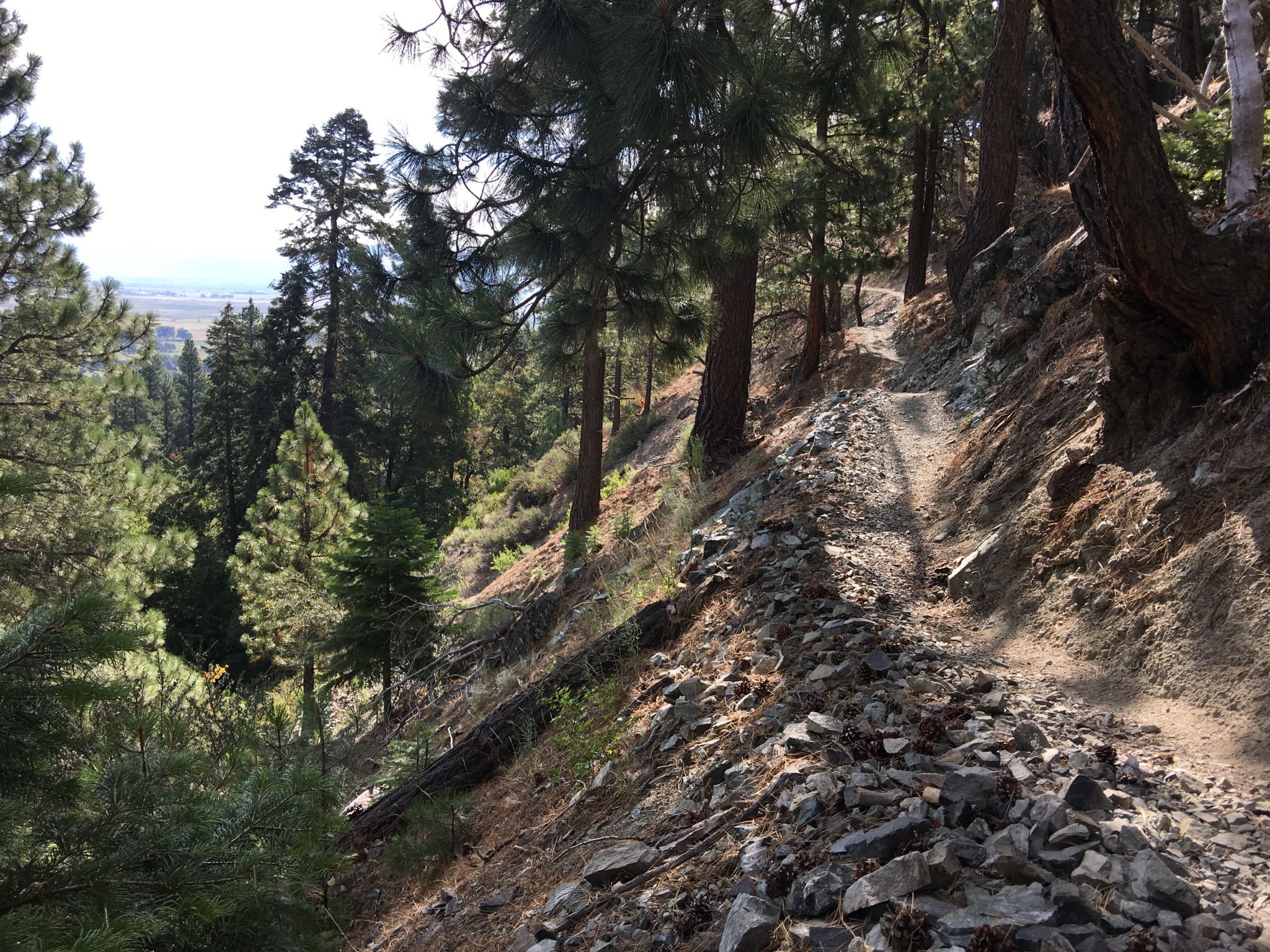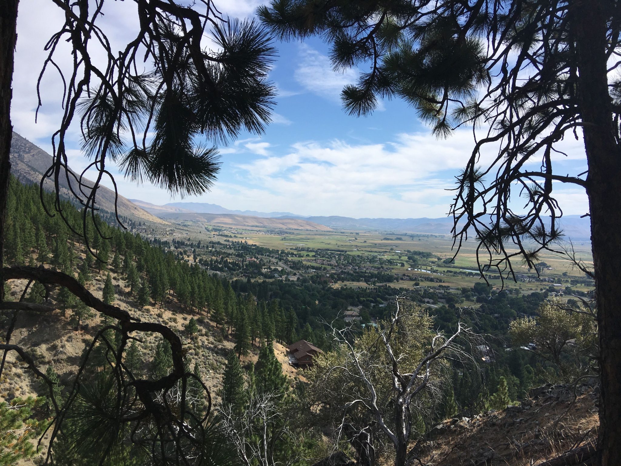村はほぼ見終わったので、Genoa Bar and Saloonから南へすぐのCarson Streetを山側へ行くと道の終わりにGenoa Canyon Trailheadがあり、ここから里山ハイキングへ。村の北端へつながるGenoa Loop Trailは全長約8.2マイル(約13km) もあるので、行けるとこまで行って、出来れば1時間半くらいで見られる滝を見てから引き返そうというプランで歩き始めました。10分程で小さな滝というか渓流を見て涼んだ後、さらに山道をすすんでいくほどにスイッチバック度が増し、そして道幅が狭い上に片側切り落としで心臓バクバク。軽い気持ちの里山散歩には向かなかったなーと30分でUターンしました。ジュノアとカーソンバレーが見渡せるくらいには登ったのでとりあえずよし!としました。次回は装備と気持ちを万端にして先にある本命滝を拝みに行きたいものです。尚、Trailheadには4~5台のスペースの駐車場(無料)がありました。