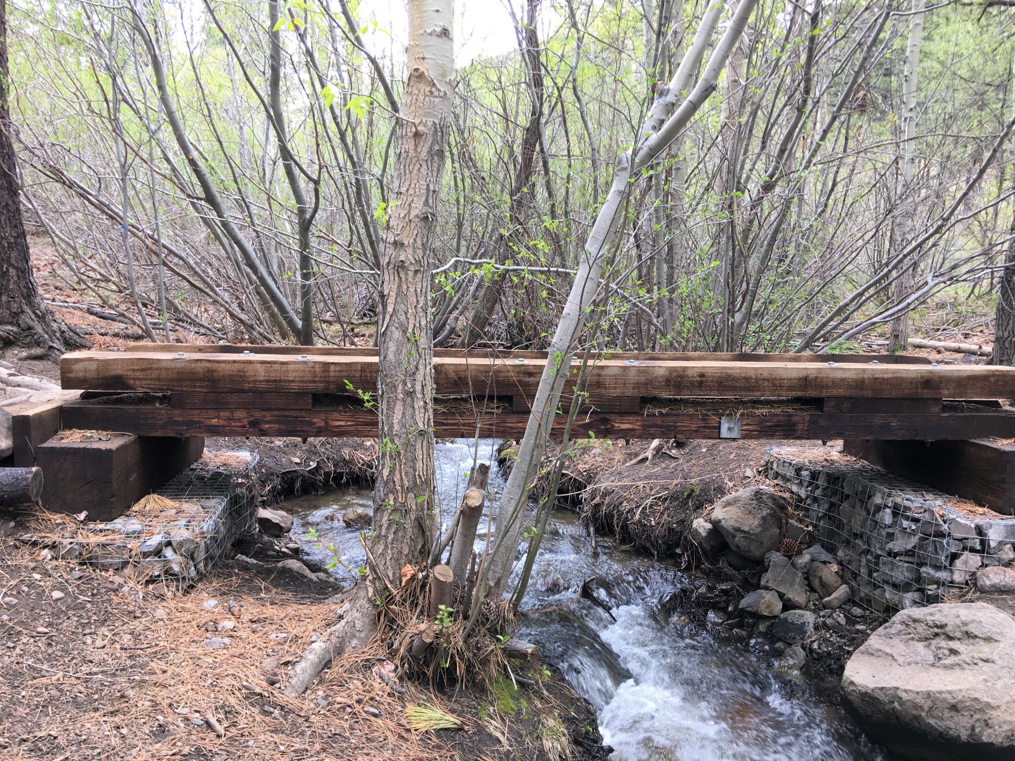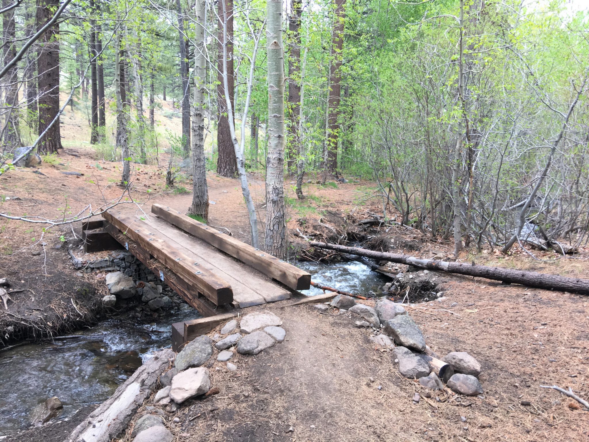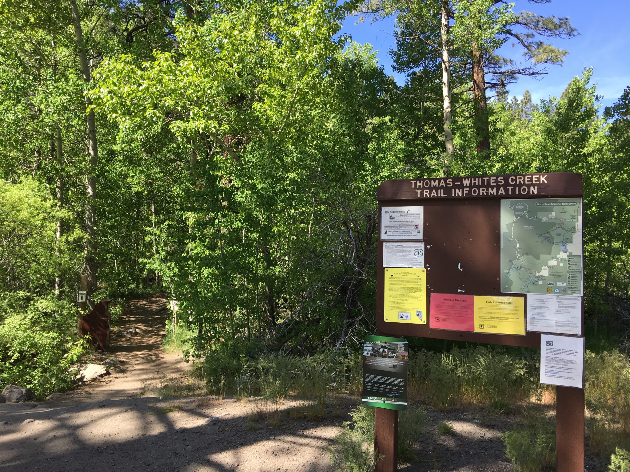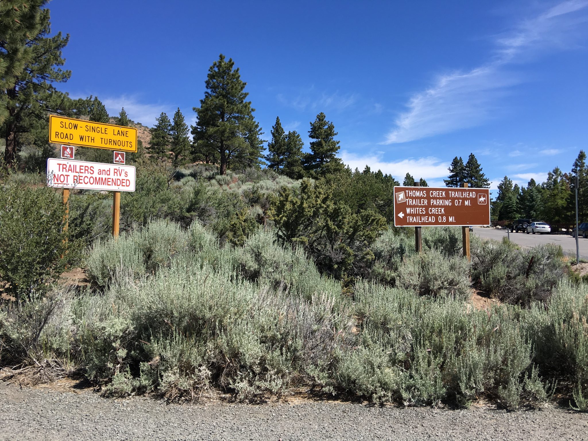 White Creek Trail同様、このTrailもビジターセンターのあるメインエントランスのエリアとは離れていて、Mt.Rose Hwy (州道431号線) をMt.Roseへ向かいメインエントランスよりも手前、2車線が1車線になる直前の角、Timberline Rd.を右へ入り数分で左に見える写真(上左)の看板を通り過ぎ更に進むと道路が未舗道となり小さな橋を渡ったThomas Creek Trailheadが最寄りのアクセスとなります。