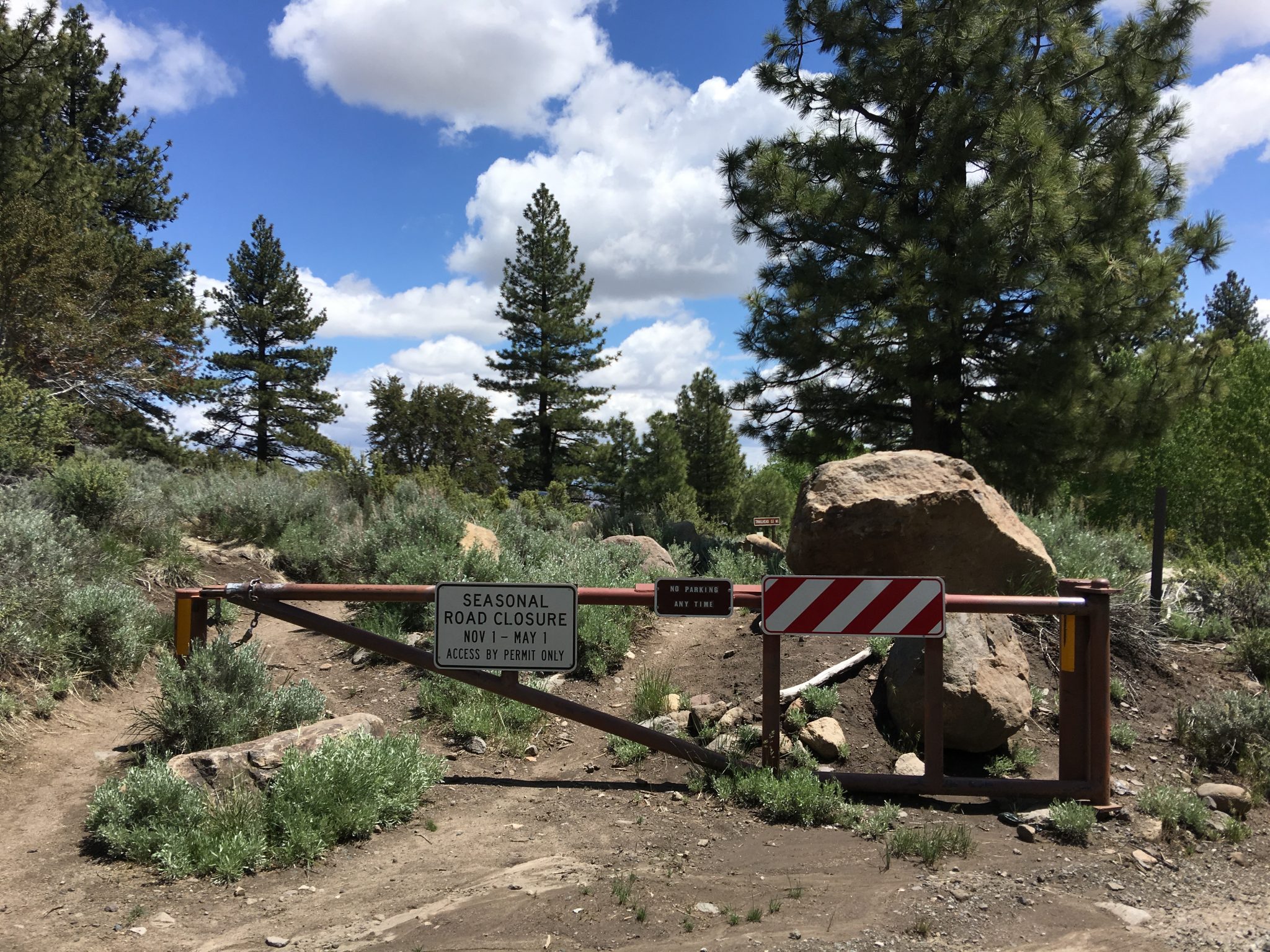 White Creek Trail同様、このTrailもビジターセンターのあるメインエントランスのエリアとは離れていて、Mt.Rose Hwy (州道431号線) をMt.Roseへ向かいメインエントランスよりも手前、2車線が1車線になる直前の角、Timberline Rd.を右へ入り数分で左に見える写真(上左)の看板を通り過ぎ更に進むと道路が未舗道となり小さな橋を渡ったThomas Creek Trailheadが最寄りのアクセスとなります。